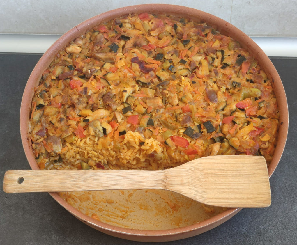 Arroz con verduras frescas, cocinadas en la paellera donde se elaborará el arroz, con este proceso se consigue que todos los sabores del pollo y vegetales se unifiquen aportando un aroma y sabor únicos. Para conseguir una mayor uniformidad se hornea. (Precio por plato).