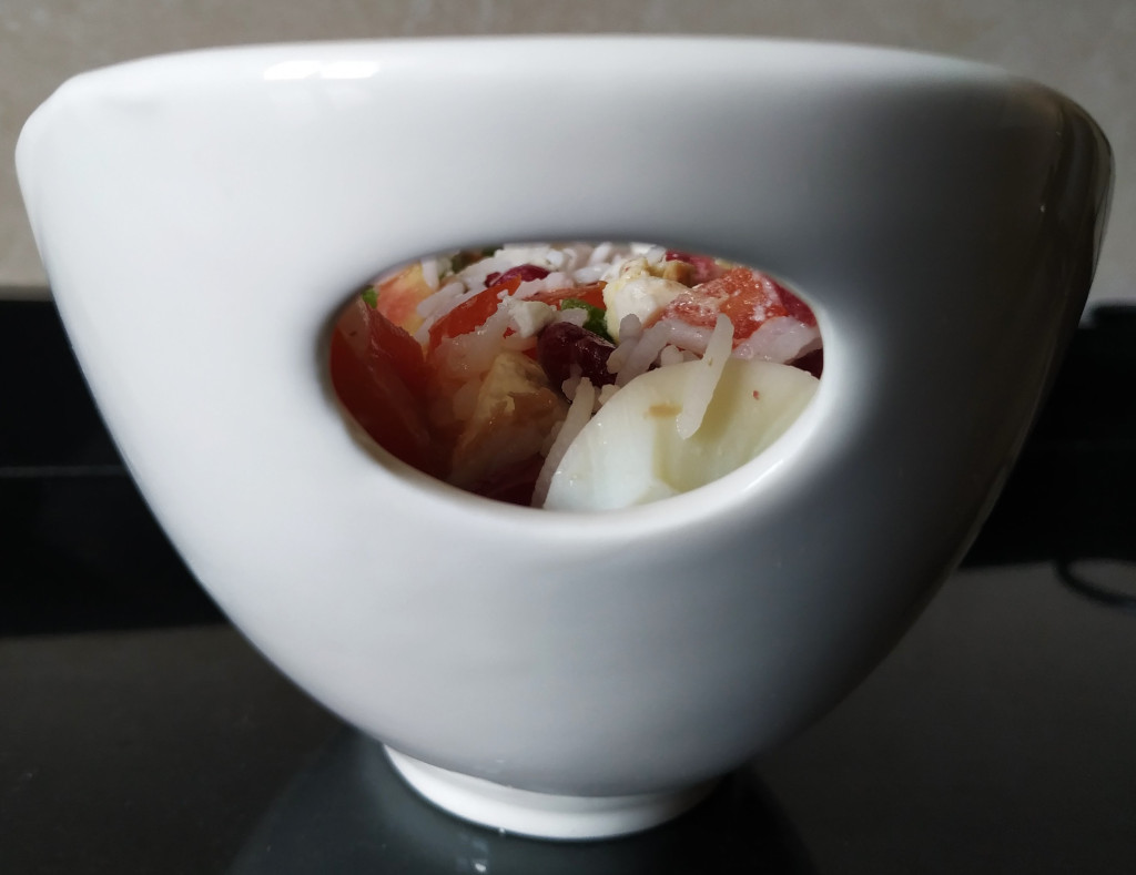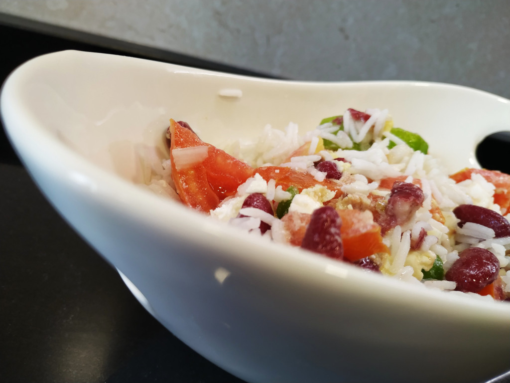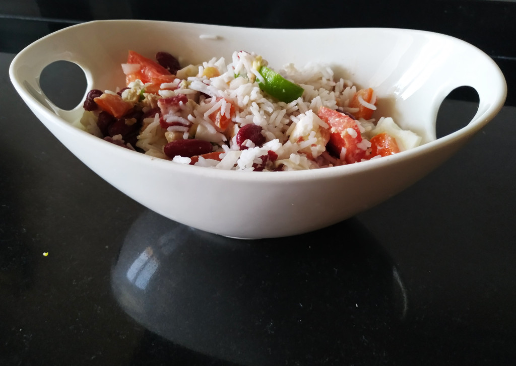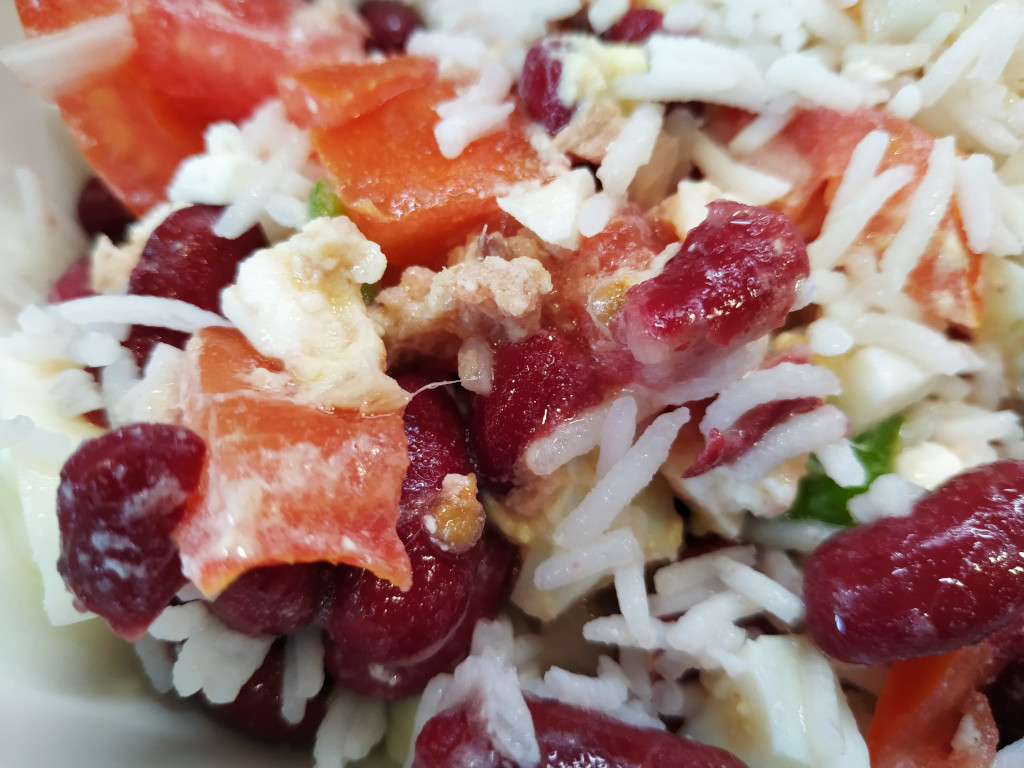 Ensalada completa con alubias rojas, arroz basmati, huevo, atún y vegetales.