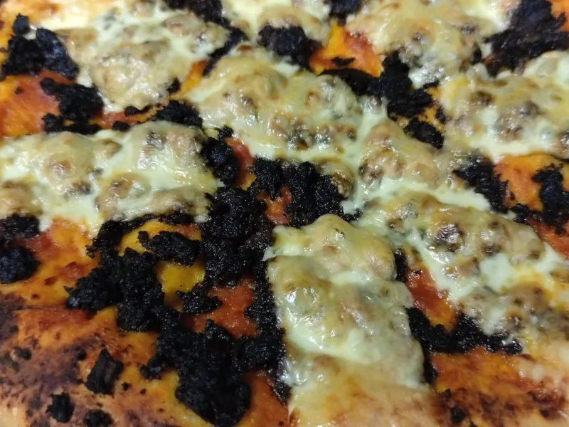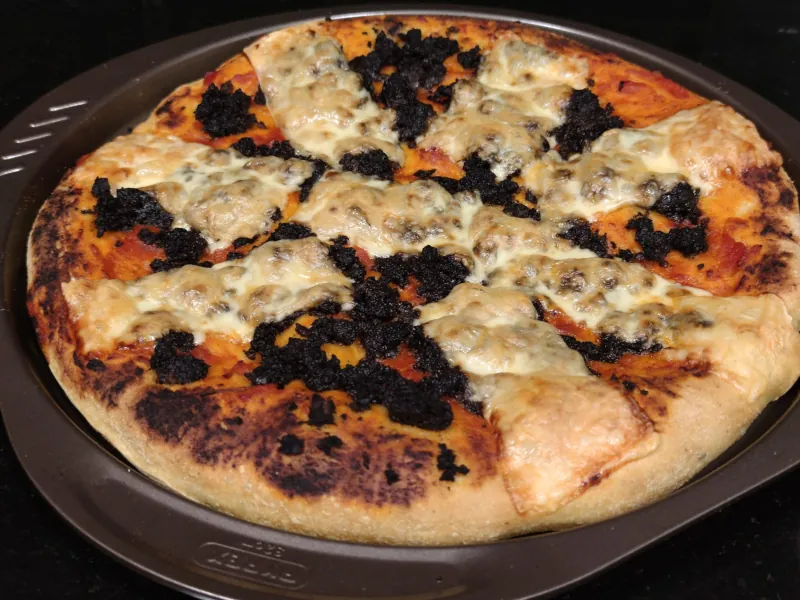 Pizza de morcilla dulce con cebolla y cuatro quesos con base de salda de tomate casera.