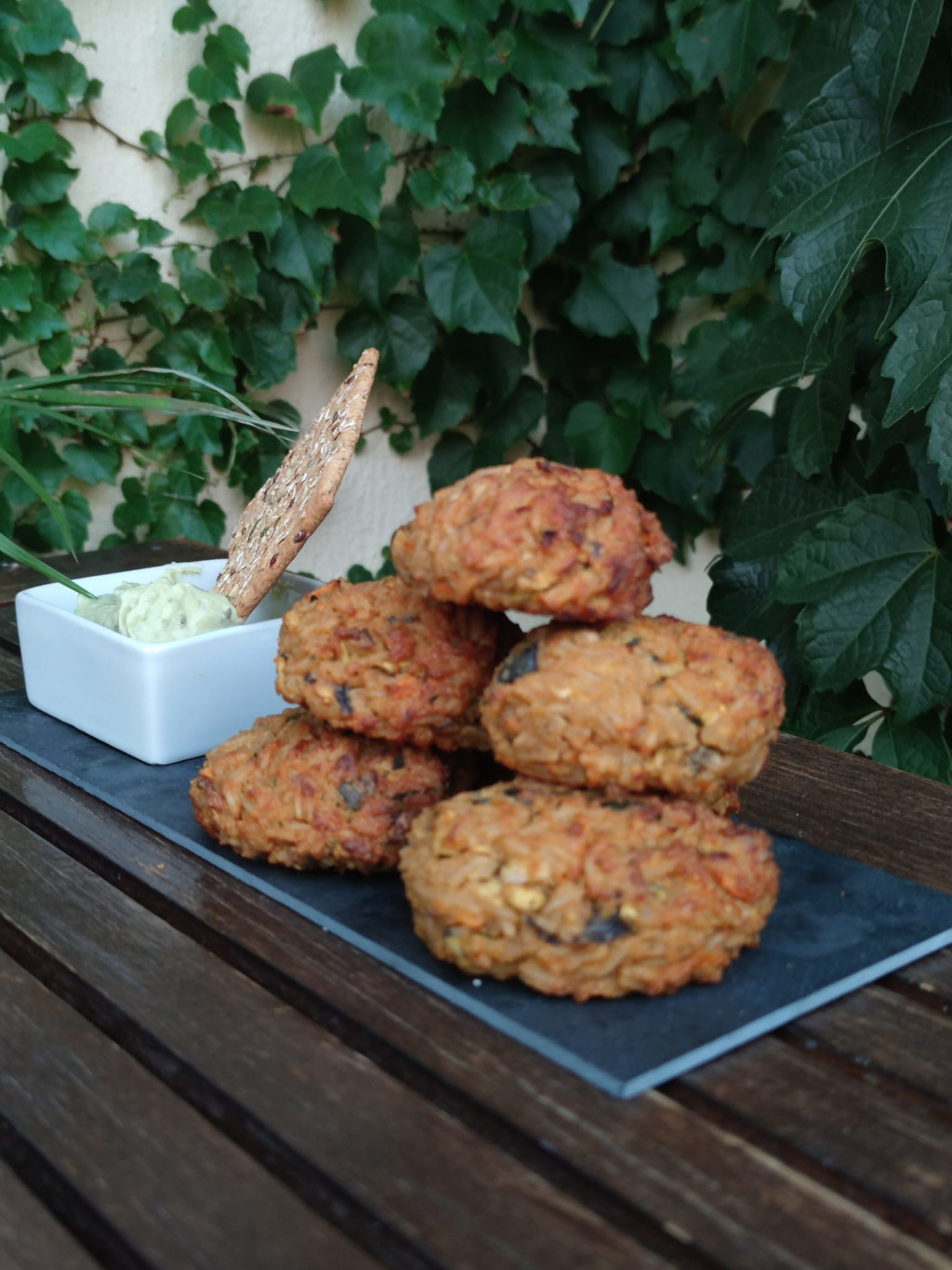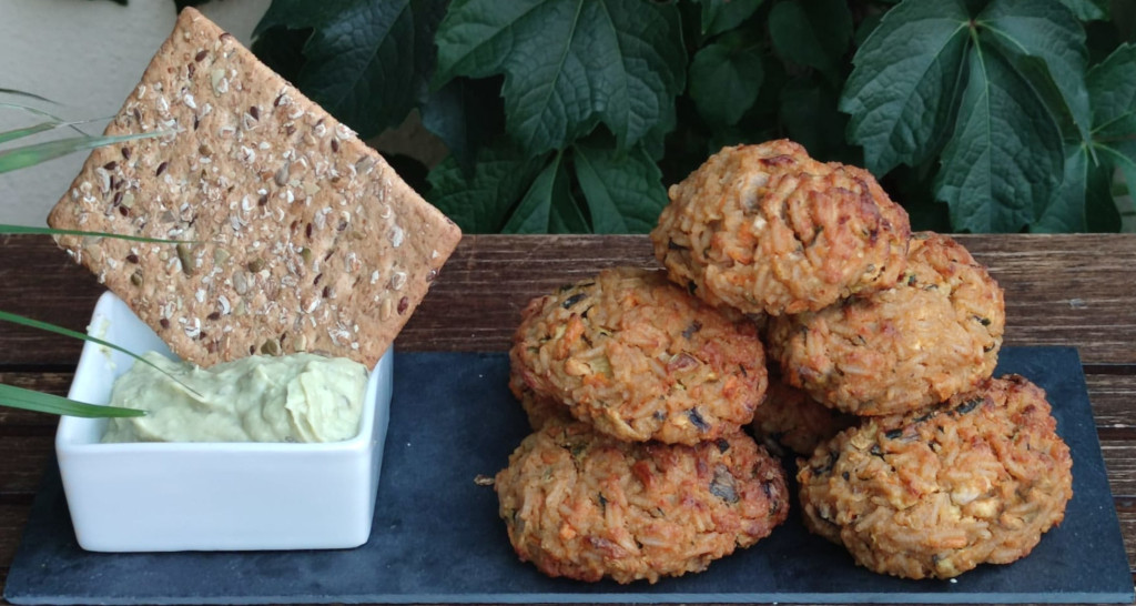 Croquetas elaboradas con arroz y una mezcla de verduras frescas con especies, todo cocinado al horno y acompañadas con una salsa de aguacate.