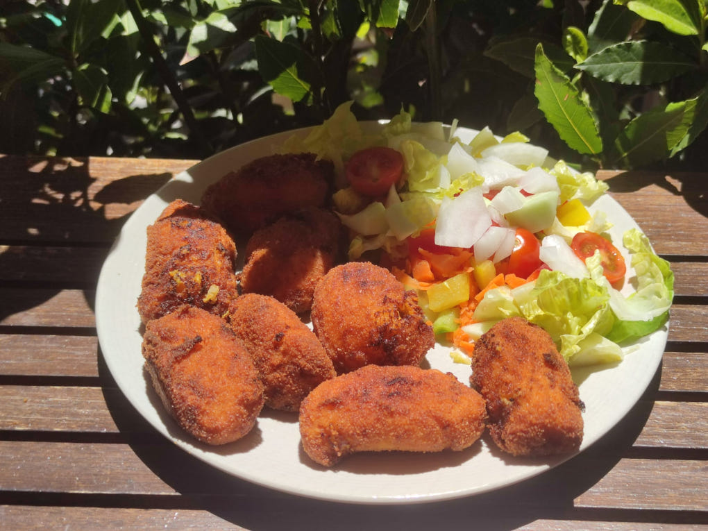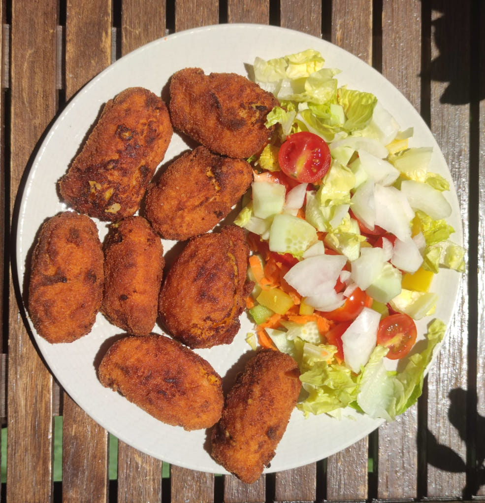 Croquetas de verduras variadas, donde el único componente animal es el huevo del rebozado y la mantequilla de la bechamel. La cantidad de croquetas oscilan entre 7 u ocho, (depende del tamaño). La ensalada está formada por tomate, lechuga, pepino, zanahoria, cebolla dulce y pimiento.