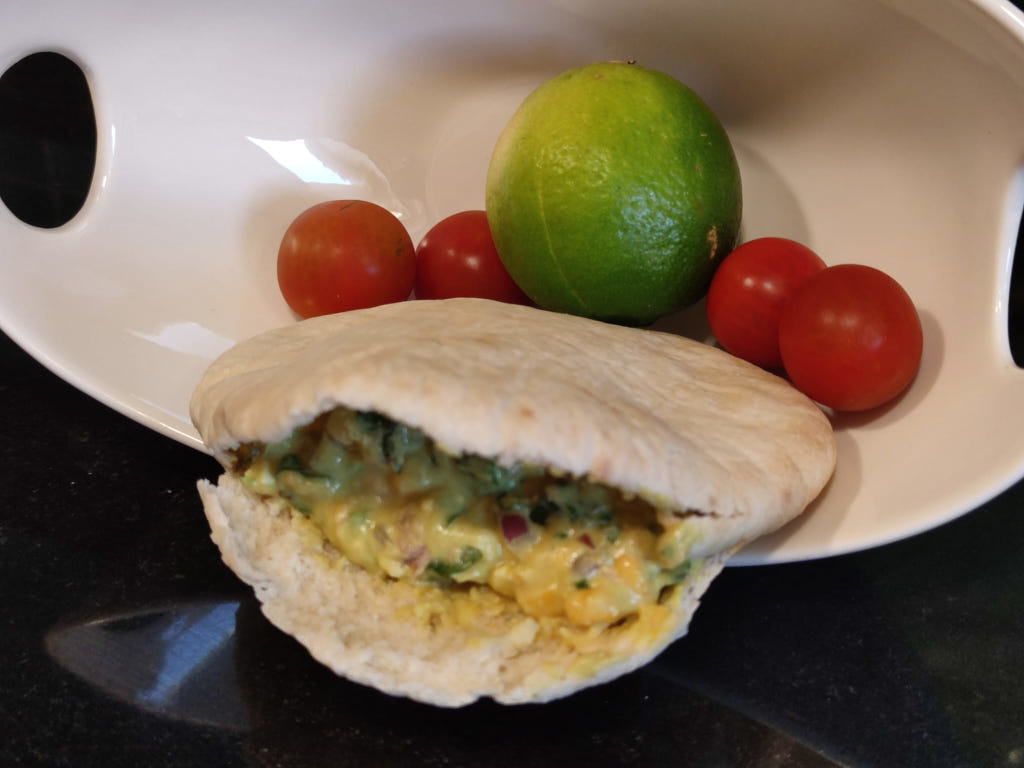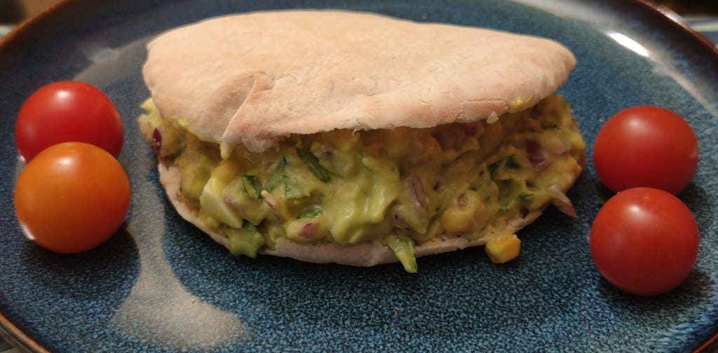 Pan de pita tostado y relleno con cebolla, huevo, mostaza, etc. todo ello aderezado con una rica salsa de aguacate.