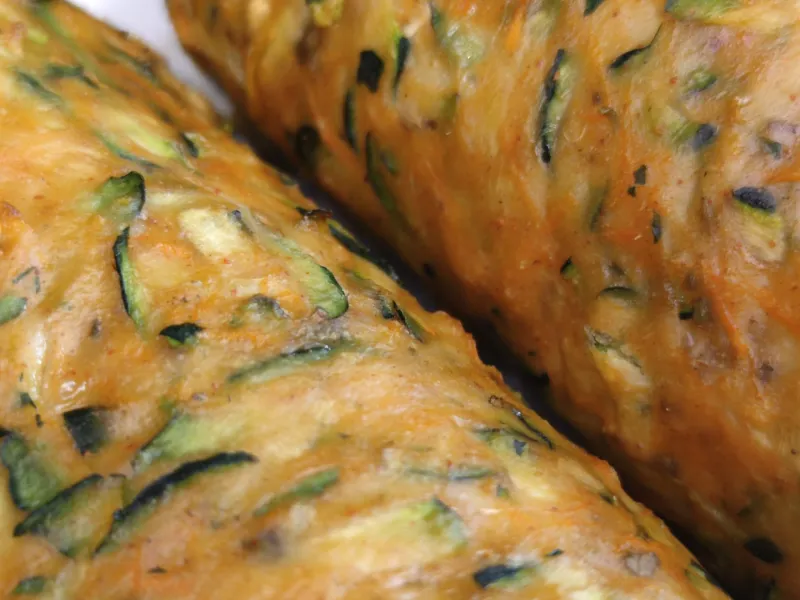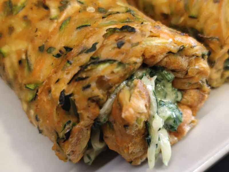 La masa que envuelve al relleno (espinacas, queso crema y queso chédar), está formada por calabacín, zanahoria, cebolla roja, especies y algo de harina.